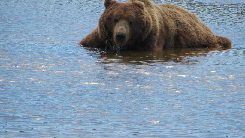 De beer die zich verderop aan onze kant van de rivier bevindt, besluit in de richting van ons en "onze" beer te lopen. Oei, wat zouden ze doen? Wij gaan staan en maken ons groot. Plof, plof, sloft hij door de rivier. Hij gaat even lekker in het water liggen, haha, wat een gezicht!