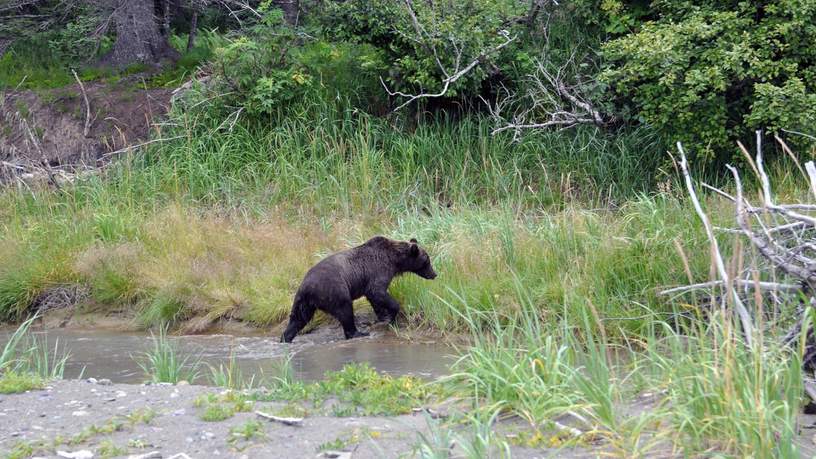 Ik breng ruim 48 uur tussen de beren door. De ene keer zie ik ze op het strand, dan weer in het achterland of in een stroompje. Op de laatste ochtend loopt er tijdens het ontbijt zomaar eentje voorbij de lodge en het hoogtepunt van mijn verblijf in Bear Mountain Lodge is het moment waarop ik klaar sta om te vertrekken. Het vliegtuig is al opgestegen vanuit Kenai om me op te halen en terwijl ik op de veranda zit te spelen met de hond van de eigenaren, komt Al ineens aangesneld. Of ik nog een laatste beer wil zien die zich ophoudt in het stroompje pal naast mijn cabin. Ik grijp mijn camera, trek mijn laarzen aan en ren achter hem aan. En warempel: daar staat een dikke bruine beer te vissen in het stroompje. We naderen hem tot op een meter of vijf maar het lijkt hem niet te deren: het enige dat hij wil is zalm! Hij doet een aantal pogingen en dan is het raak. Hij heeft een grote zilveren zalm in zijn bek en met slechts één kaakbeweging kraakt hij de botten van de vis. Binnen een minuut is er niks meer van de zalm over en schuift de beer weer verder de rivier door, op zoek naar zijn volgende prooi. Wát een afsluiting van mijn vakantie!