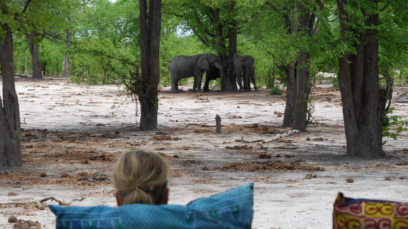Aangekomen bij het kamp worden we ontvangen door het hartelijke personeel met een koel drankje. Daarna hebben we de tijd om ons even op te frissen in onze tent, maar eigenlijk wil ik helemaal nergens heen. Ik wil hier blijven, op de veranda die uitkijkt over de waterpoel. Er staat namelijk een olifant te drinken. Wanneer ik rustig plaatsneem in de stoel, zie ik vanuit mijn rechter ooghoek vier olifanten onder de bomen verkoeling zoeken tegen de warmte. Plots hoor ik een hard getetter van achter de lodge. Het moeten de twee olifanten zijn, die een paar tellen later links van mij in een drafje, nog blazend naar elkaar, naar het water rennen. Ik kan hier nog uren zitten, maar ik moet me echt gaan klaarmaken voor de safari die we gaan maken. Toch weet ik het nog vijf minuten te rekken en zie ik een moeder olifant met een klein jong uit de struiken verschijnen. Onwetend over wat hij nu eigenlijk met zo’n slurfje moet, rent de kleine schuddend en schommelend met zijn kop naar het water voor een verkoelend modderbad. Daar blijf ik telkens weer van genieten.”