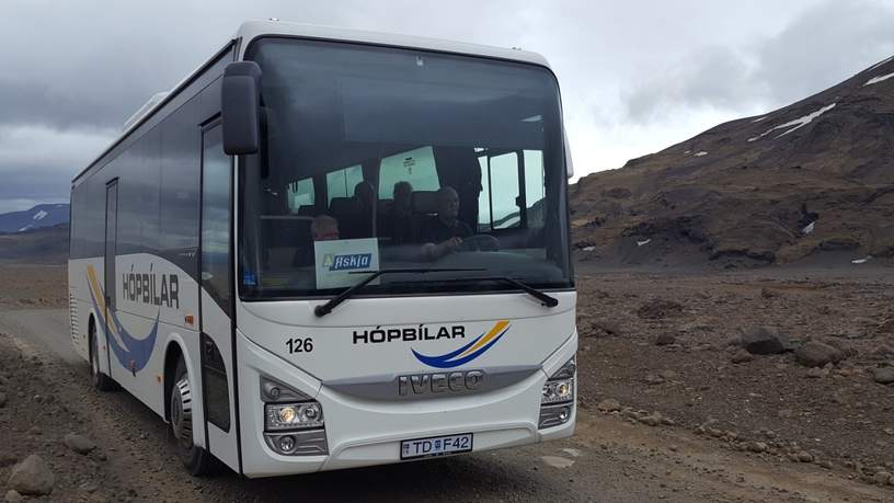 We overnachten in Varmahlid, een kleine plaats op het kruispunt tussen Noord- en West-IJsland. Van daar gaat het richting Reykjavík. Maar eerst nog de hoogtepunten van de Gouden Cirkel: Geysir, Gullfoss en de kloof Thingvellir. Voordat we daar zijn, heeft Jon nog een verrassing voor ons in petto. Ik heb gisteren al met hem gekeken naar een andere route, een binnenlandroute. Het is al een paar dagen goed weer, geen regen en dan kan het dat we een dergelijke route met de bus kunnen rijden. Jon belt met andere chauffeurs en zijn baas, we houden een slag om de arm en vertellen nog niet wat we van plan zijn. Dan geeft Jon aan dat zijn baas gebeld heeft en hij kan én mag deze bijzondere route, een zestig kilometer onverharde weg door het binnenland, nemen. We rijden de Kaldidalur route, langs de ijskappen, door het stof, we hobbelen en iedereen geniet van dit avontuur en de geweldige uitzichten die het oplevert.