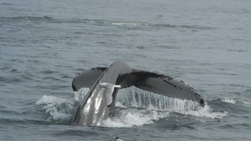 Na ongeveer een uur varen, zien we in de verte twee kleine boten vlak bij elkaar. Opletten dus, zou er wat zijn, die zijn daar immers ook niet voor niks. Als we dichterbij komen, zien we ook heel veel meeuwen rondvliegen en op het water zitten. Zou het? Dan zien we ineens een staart en een vin en nog één en nog één, zelfs twee tegelijk. Het is een ongelofelijk mooi schouwspel vlak voor onze neus. Zeven of acht bultruggen en vier minke whales zijn aan het foerageren. Met opengesperde monden en opstaande staarten zwemmen ze rond en vlakbij de boten. Mijn groep beseft zich niet hoeveel geluk ze hebben om dit te kunnen zien. Zo veel, zo dichtbij en zo lang!