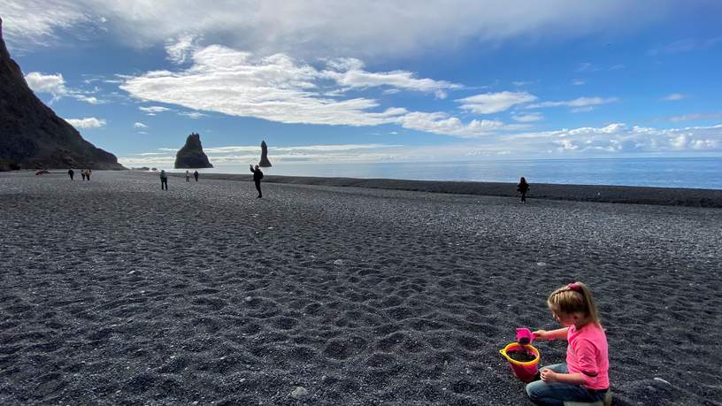 We rijden langs de zuidkust naar Vik. Een klein maar sfeervol dorpje waar we 2 dagen de tijd nemen om de omgeving te verkennen. Vik heeft een gitzwart strand wat erg veel indruk maakt op onze 5 jarige. Met haar roze emmer en schep vermaakt ze zich uren terwijl wij ondertussen genieten van het mooie uitzicht en het zonnetje. Wat is IJsland toch mooi!