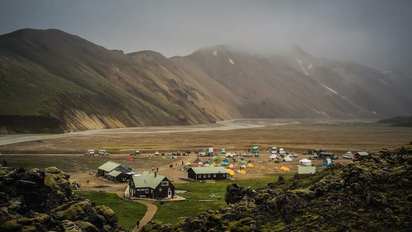 Aan de voet van de kleurrijke ryolietbergen van Landmannalaugar vind je een camping. Om bij de camping te komen moet je eerst de rivier door. Dat is al een belevenis op zich en niet iedereen haalt de overkant… Je kunt er nog echt in the middle of nowhere kamperen en toch met enige luxe. Er is inmiddels een verwarmd toiletgebouw, vol met drogende kleding en gezelligheid. Iets voorbij het gebouw staat het huis van de Wardens, de beheerders van de camping. En niet te vergeten de Mountain Mall: twee oude schoolbussen met daarin een café en een klein winkeltje met de beste verse vis uit de omtrek. Daar weer achter stroomt een warme beek. Een vlonder pad leidt naar een platform boven de moerassige ondergrond, daar laat je je schoenen, kleding en handdoek achter om je rustig in het warme water te laten zakken. IJslanders liggen graag in hotpots – zowel de natuurlijke als de zwembaden – dus moet je altijd je zwemkleding bij de hand hebben! Hier liggen mensen midden in de natuur in het warme water te ontspannen. Een plek om echt te genieten.