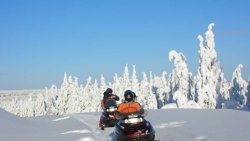 Het is altijd wel weer even wennen, zo’n grote machine. Je moet je goed inpakken met een dikke thermo overall aan en helm op, want we gaan een tocht van 50 kilometer maken. Al na een paar minuten ben ik helemaal in mijn element en voelt het volledig vertrouwd. Ook weet ik weer waarom ik nooit kan kiezen tussen de huskysafari of de sneeuwscootersafari. Ik geniet volop van de snelheid en actie die je voelt tijdens een sneeuwscootersafari. Het eerste stuk gaat over smalle bospaden, je moet hier echt wel even goed opletten dat je goed stuurt. We gaan ook nog niet zo snel, maar dat is prima, want zo kan je volop genieten van de besneeuwde bossen en het prachtige landschap.