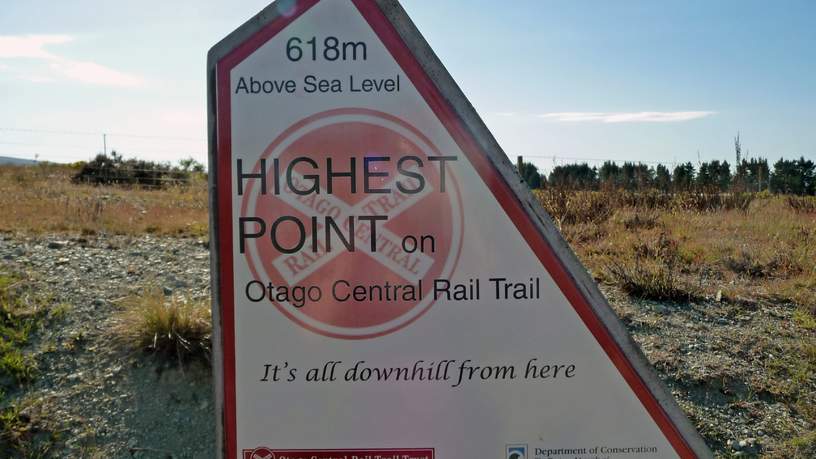 In Wedderburn verblijf ik in een prachtige cabin met uitzicht over de weidse landschappen van de Otago. Het ontbijt staat voor me klaar en zodra ik de gordijnen open doe, schijnt de zon me al tegemoet. Tijd om op pad te gaan want het belooft een prachtige dag te worden! In de ochtend is het nog fris en koel en dus is het zaak om flink wat kilometers te maken. Vanaf Wedderburn loopt het eerst een stuk omhoog en dan volgt het bord '618 meters above sealevel, it's all downhill from here.' Dit klinkt bemoedigend, maar ik wil er wel bij zeggen dat de trail nog steeds af en toe op en neer gaat en er moet dus zeker ook wel gewerkt worden onderweg.