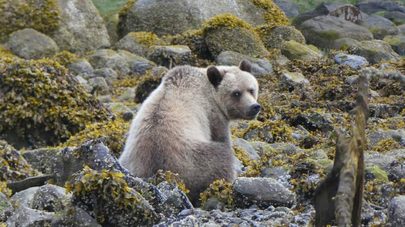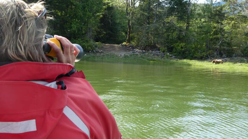 In het voorjaar stap je aan boord van een kleine, elektrische boot en speur je de oever van Glendale Cove af naar grizzlyberen. Ze zijn dan net uit hun winterslaap ontwaakt en de kans is groot dat je een stel langs de kust ziet struinen op zoek naar krabbetjes. Iedere steen wordt zorgvuldig omgekeerd in de hoop dat er één onder verscholen zit. Al zijn ze ook dol op het jonge, groene gras. Als er een beer langs de oever wordt gespot, dan zorgt de gids dat jullie - met zo min mogelijk verstoring - vrij dichtbij kunnen komen. Het is zonder meer een bijzonder moment, al zal je er vrij snel achter komen dat beren toch íets groter zijn dan dat je wellicht dacht. Zoals onze collega Manuela grappend tegen de gids zei: "We kunnen ook wel een stukje achteruit, ik kan inzoomen met mijn camera".