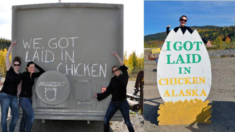 In Chicken staat een bord in de vorm van een ei met de tekst: ‘I got laid in Chicken’. Een leuke fotostop en niet veel later besluiten we onze vuile camper een opknapbeurt te geven. Op de achterkant schrijven we ‘We got laid in Chicken’, een grapje dat je eigenlijk alleen begrijpt als je in Chicken bent geweest. Onderweg levert het veel getoeter, commentaar en leuke conversaties op. De vriendelijke Canadezen kunnen er gelukkig om lachen, ze snappen onze vorm van humor. Een week later leveren we onze camper weer in in Whitehorse. Ook de verhuurder kan er hartelijk om lachen. Dat ze de inmiddels dik aangekoekte modder door ons geschrijf op de achterkant moeilijk kunnen verwijderen, is voor deze keer slechts bijzaak.