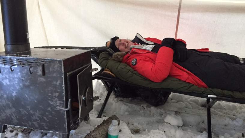 Onze twee gidsen (Marie Claude is de musher en Niall heeft een sneeuwscooter met alle spullen erop en -achter) hadden de tenten eerder al opgezet. Eerst gaan we de honden uitspannen. (Rule No 1: dogs first!) Niall stort zich daarna met zichtbaar enthousiasme op een paar bomen die in no-time met de motorzaag in stukken zijn gezaagd. Marie Claude zwaait achteloos met een enorme bijl in de rondte en splijt het hout in handzame stukken. De kachels in de tenten worden roodgloeiend opgestookt en de US army slaapzakken (goed tot min 40!) op een stretcher uitgerold. Karin komt de tent in en kijkt wat zorgelijk naar de sneeuw. Diezelfde sneeuw is namelijk de vloer van de tent. Maar Niall verzekert ons dat sneeuw uitstekend isoleert en dat het straks heerlijk warm is. Karin lijkt niet helemaal overtuigd..