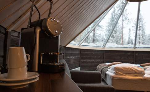 De cabins zijn comfortabel ingericht met 2 bedden. De bedden staan onder het glazen dak en vanuit je bed kan je dus elke avond naar het noorderlicht speuren. De daken hebben verwarming, dus als er sneeuw is gevallen kan je dat laten smelten om uit het raam te kijken. Op de kamer zijn koffie (nespresso)- en thee faciliteiten en er is een klein koelkastje. De kleine badkamer heeft een douche en toilet en er is wifi in je cabin.