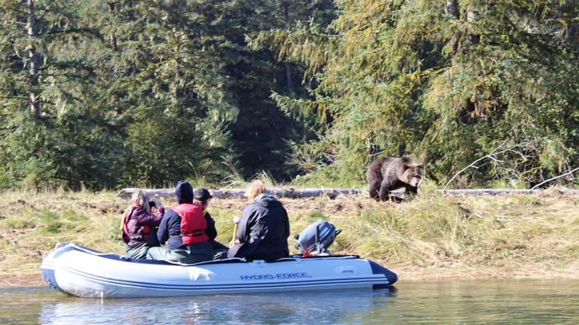 Na het ontbijt verzamelen we om 08.00 uur op de steiger voor een volledige dag beren spotten. We bezoeken meerdere plekken in diverse riviermondingen, waar we per zodiac op zoek gaan naar de grizzlyberen of te voet, afhankelijk van het tij. De lodge maakt geen gebruik van platvorms om de dieren in een zo natuurlijk mogelijke omgeving te kunnen zien. Om 16.30 uur ben je terug in de lodge en volgt het diner weer om 18.00 uur. 's Avonds krijg je een presentatie over het Great Bear Rainforest, Bears of de cultuur van de First Nations.
